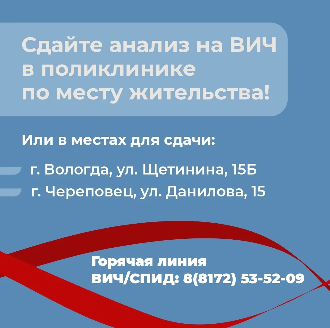 📍Центр профилактики и борьбы со СПИДом (г. Череповец, ул. Данилова, д. 15). Регистратура: 7 (820-2) 57-36-64.