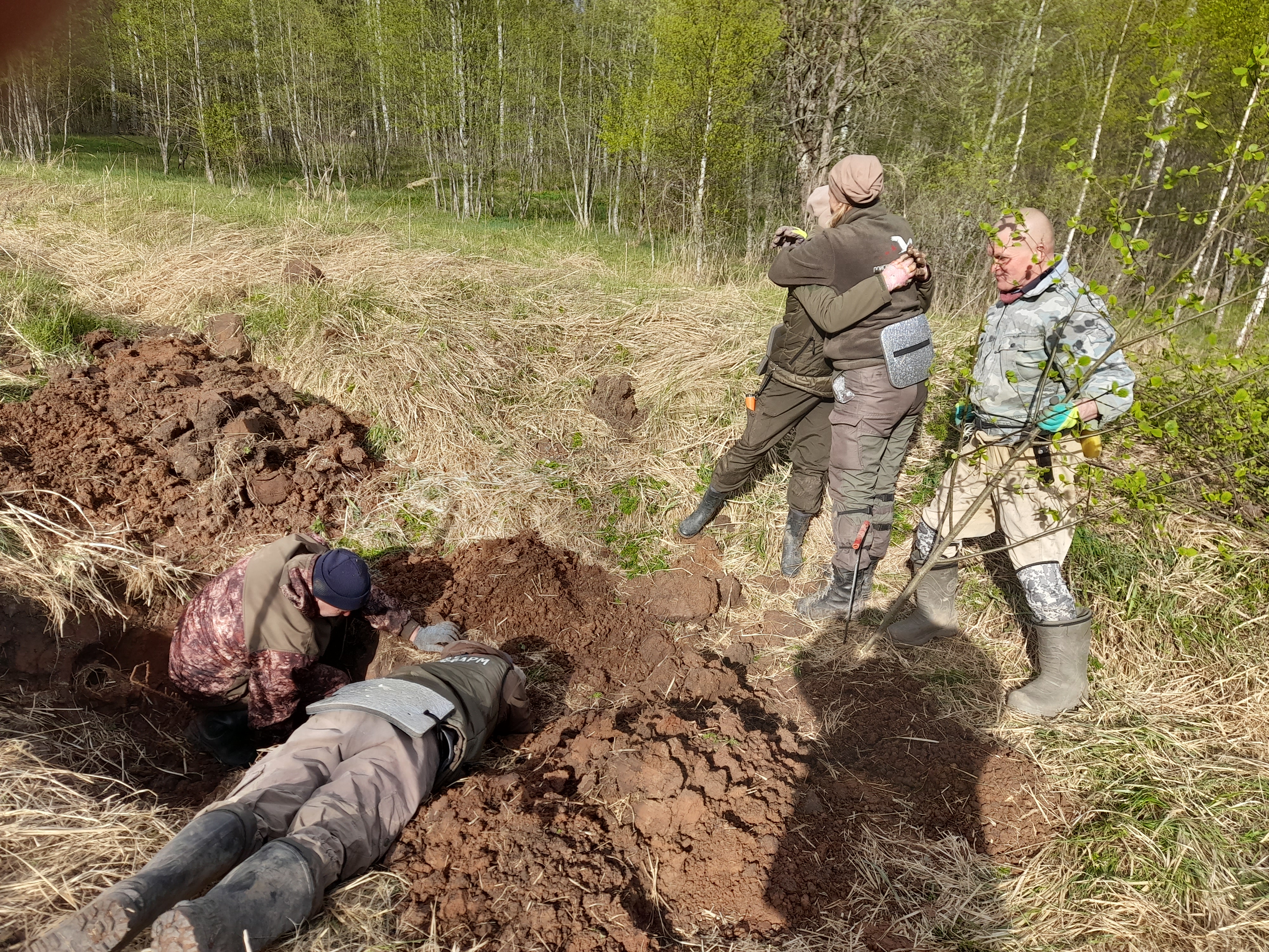 Медальонов пока тоже не обнаружено. Поэтому усилиями нескольких отрядов будет продолжать информационный поиск по координатам места и архивным документам, чтобы знать, кого мы нашли и кого упокоили по всем христианским правилам под конец вахты памяти перед 9 Мая – возле мемориала в деревне Демяхи.
