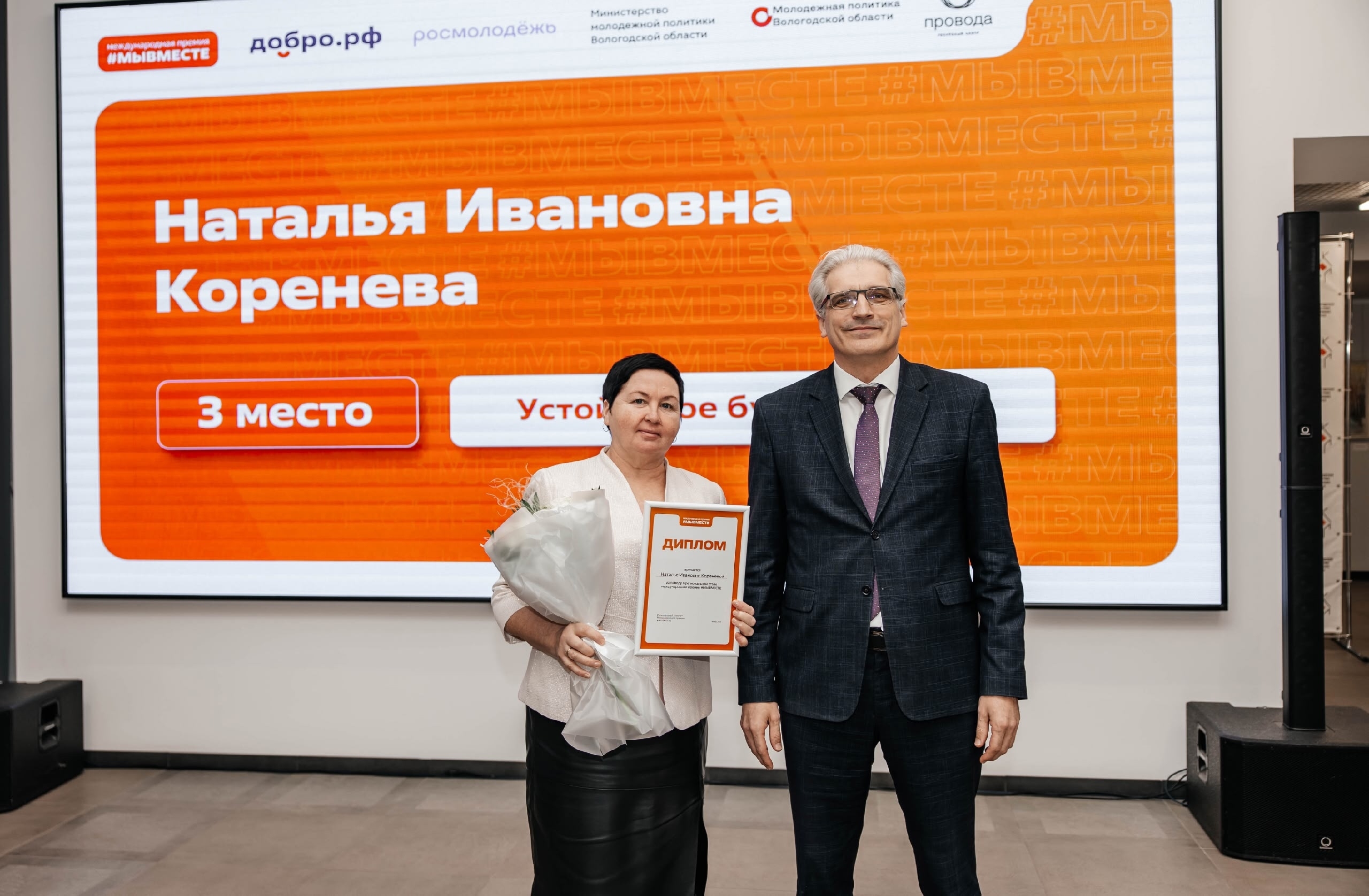 Среди победителей регионального этапа в этом году авторы инициативы «Журавли.СВОи35», «Объединение психологической помощи семьям с детьми участников СВО «Просто быть рядом», «Дверь в солнечный мир», «Герои нашего времени», «Инклюзивный волонтёрский центр «Могу помогать» и другие. В каждой из номинаций определено по три призёра. Так, в одной из них – «Некоммерческие организации» – в категории «Устойчивое будущее» третье место присуждено проекту Фонда «Соль земли» «ПриСОЛЬединяйся». Награду на правах члена проектной команды получила заместитель директора Тотемского музейного объединения Наталья КОРЕНЕВА: