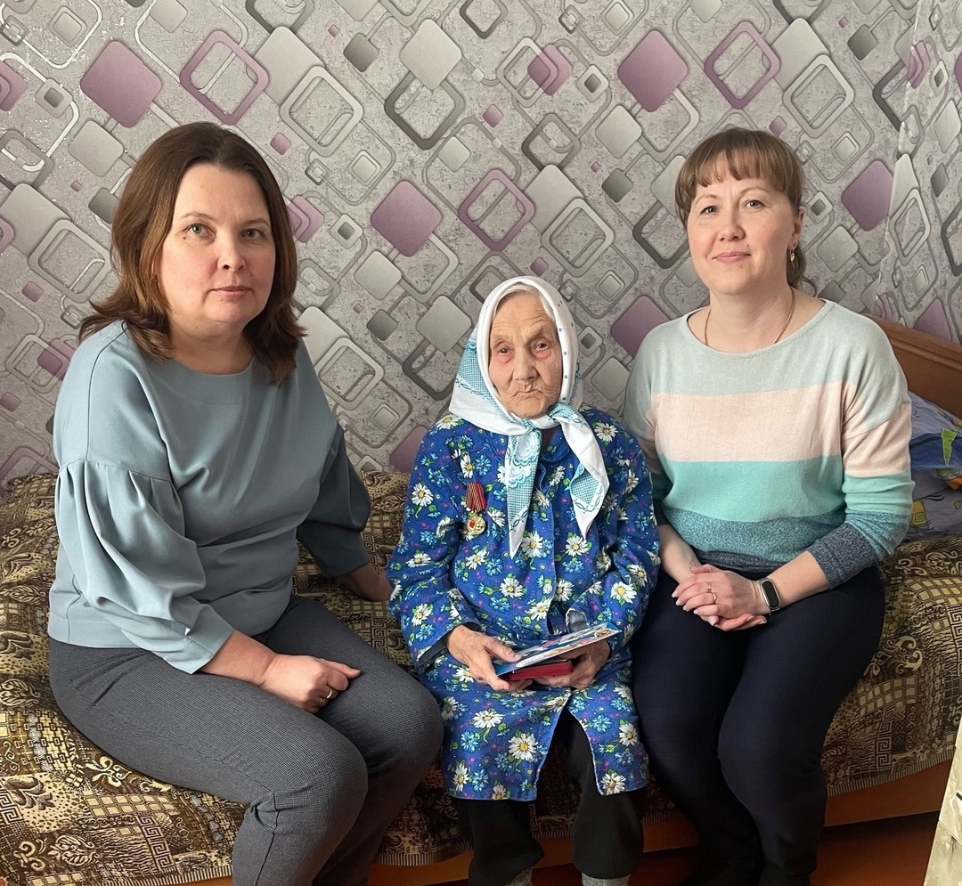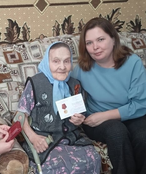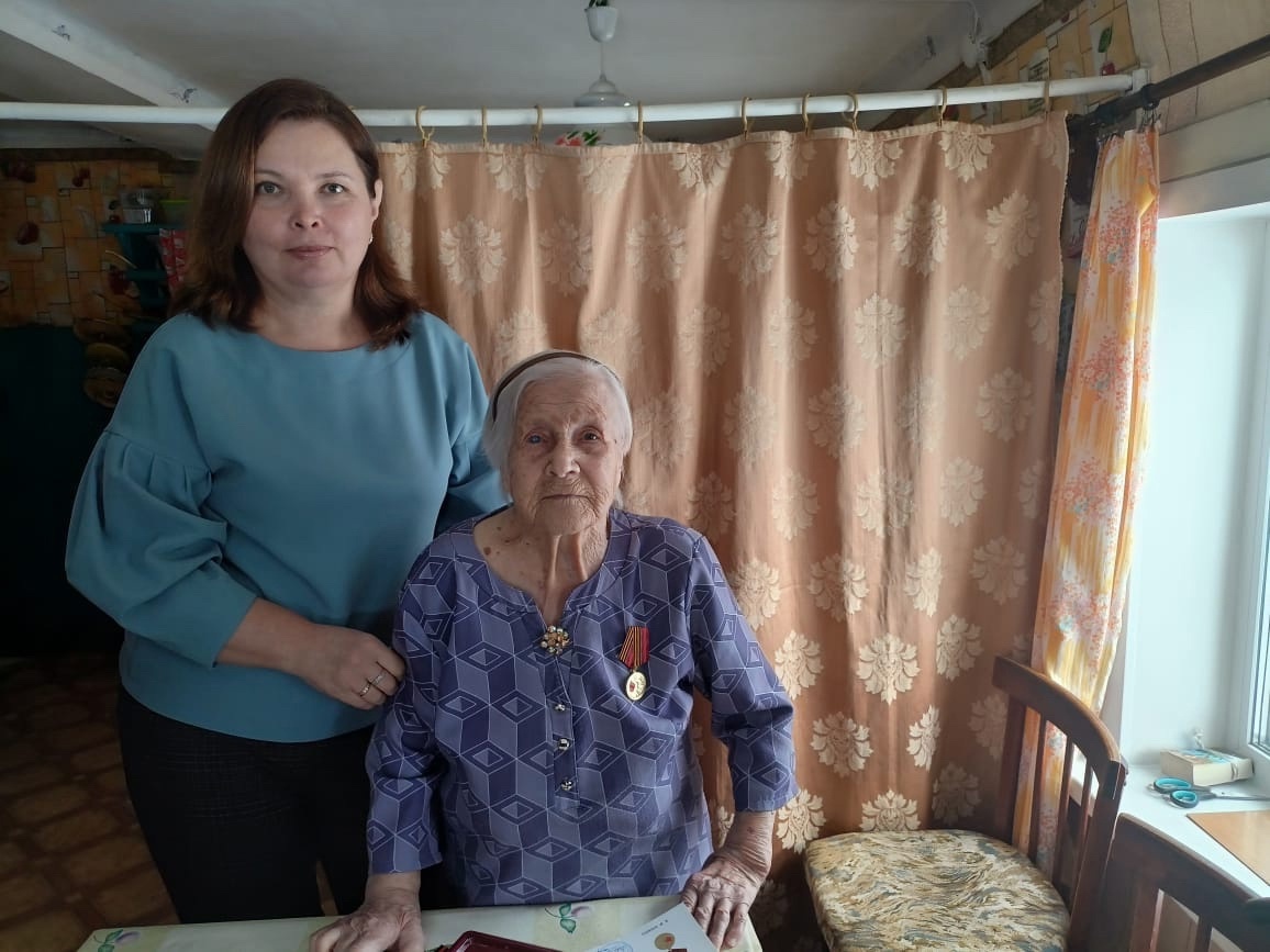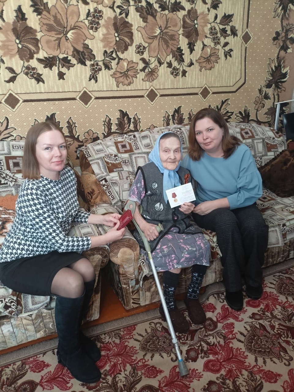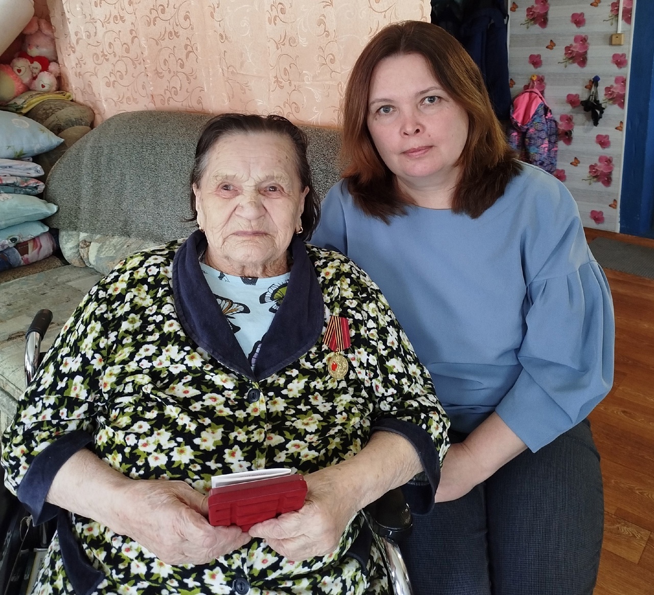 Медаль 95-летней Марии Феодосьевне Коточиговой вручила глава Калининского ТУ Елена Рычкова с инспектором вожбальской территории Галиной Холмогоровой.