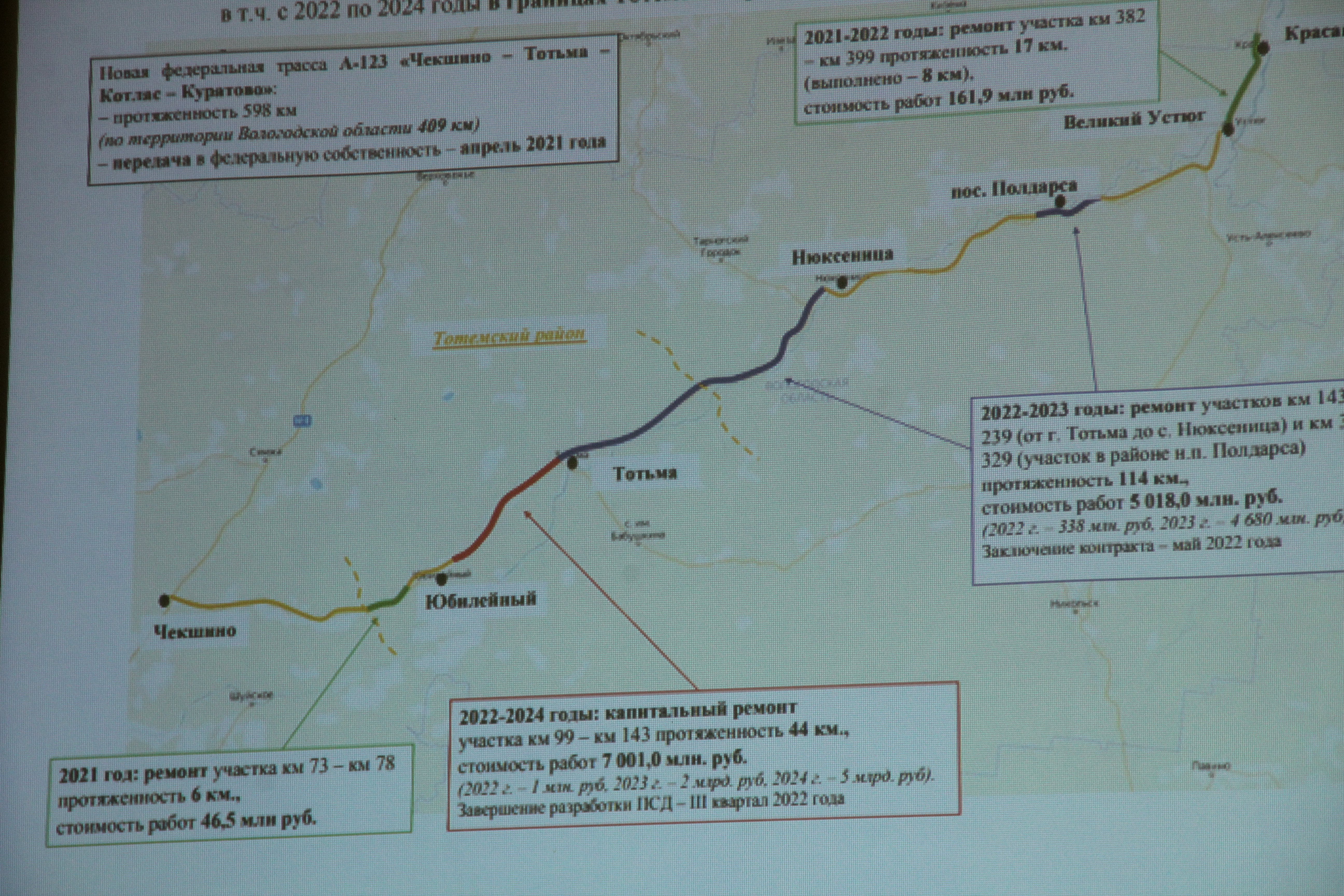 Главная транспортная артерия «Чекшино – Тотьма – Котлас – Куратово» в 2021-0м по инициативе губернатора передана в федеральную собственность. Тогда же отремонтированы два наиболее проблемных участка протяжённостью 14 км. До конца 2022-го реконструируют ещё один отрезок длиной девять километров. Самым масштабным, с точки зрения объёмов, станет следующий год ‒ на этот период запланировано обновить 94 км, в том числе участок Тотьма ‒ Нюксеница (контракт на проведение ремонта будет заключён уже в этом мае). В 2024-ом приведут в порядок 44 километра от Юбилейного до Тотьмы ‒ разработка проектной документации ведётся. Таким образом, в течение трёх лет на 9,3 миллиарда рублей отремонтируют свыше 181 км федеральной трассы А-123, половина которой ‒ в границах нашего района.