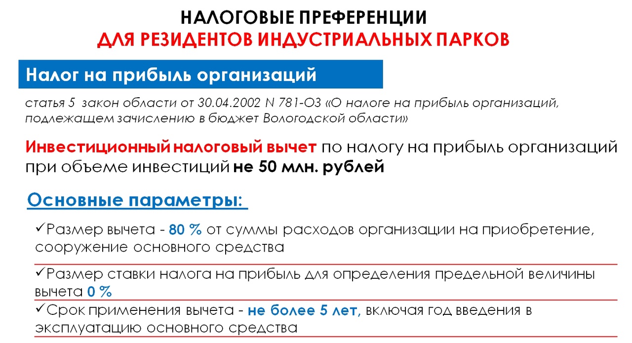 В инфокарточках представлена информация о налоговых преференциях для резидентов индустриальных парков.