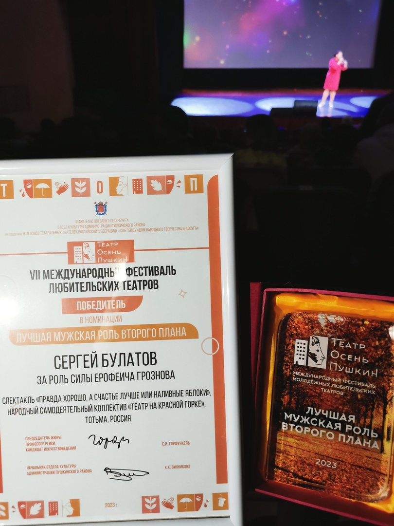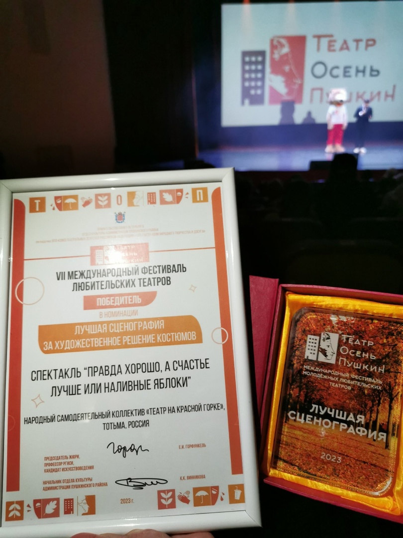 До последнего дня не знали, отметят профессионалы игру тотьмичей или нет. Профессор Российского государственного института сценических искусств Елена Горфункель, артист театра и кино, режиссёр Сергей Шенталинский и преподаватель кафедры режиссуры ГИТИСа Татьяна Тарасова высоко оценили старания земляков. По итогам фестиваля «Театр на Красной горке» стал победителем в номинации «Лучшая сценография», а Сергей Булатов – «Лучшая мужская роль второго плана». Более чем результативная поездка!