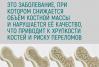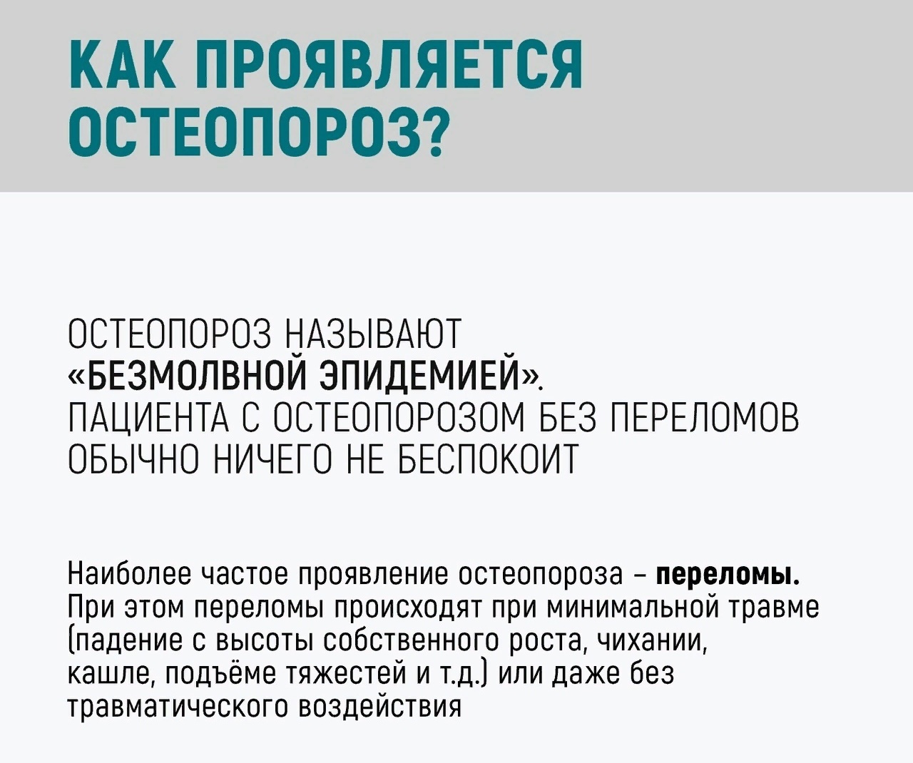 Остеопороз – это заболевание, при котором снижается объем костной массы и нарушается ее качество, что приводит к хрупкости костей и риску переломов. У половины людей, перенесших в результате остеопороза хотя бы один перелом, в течение двух лет случается повторный. После первого перелома риск развития повторного увеличивается в три раза, после второго – в пять раз.