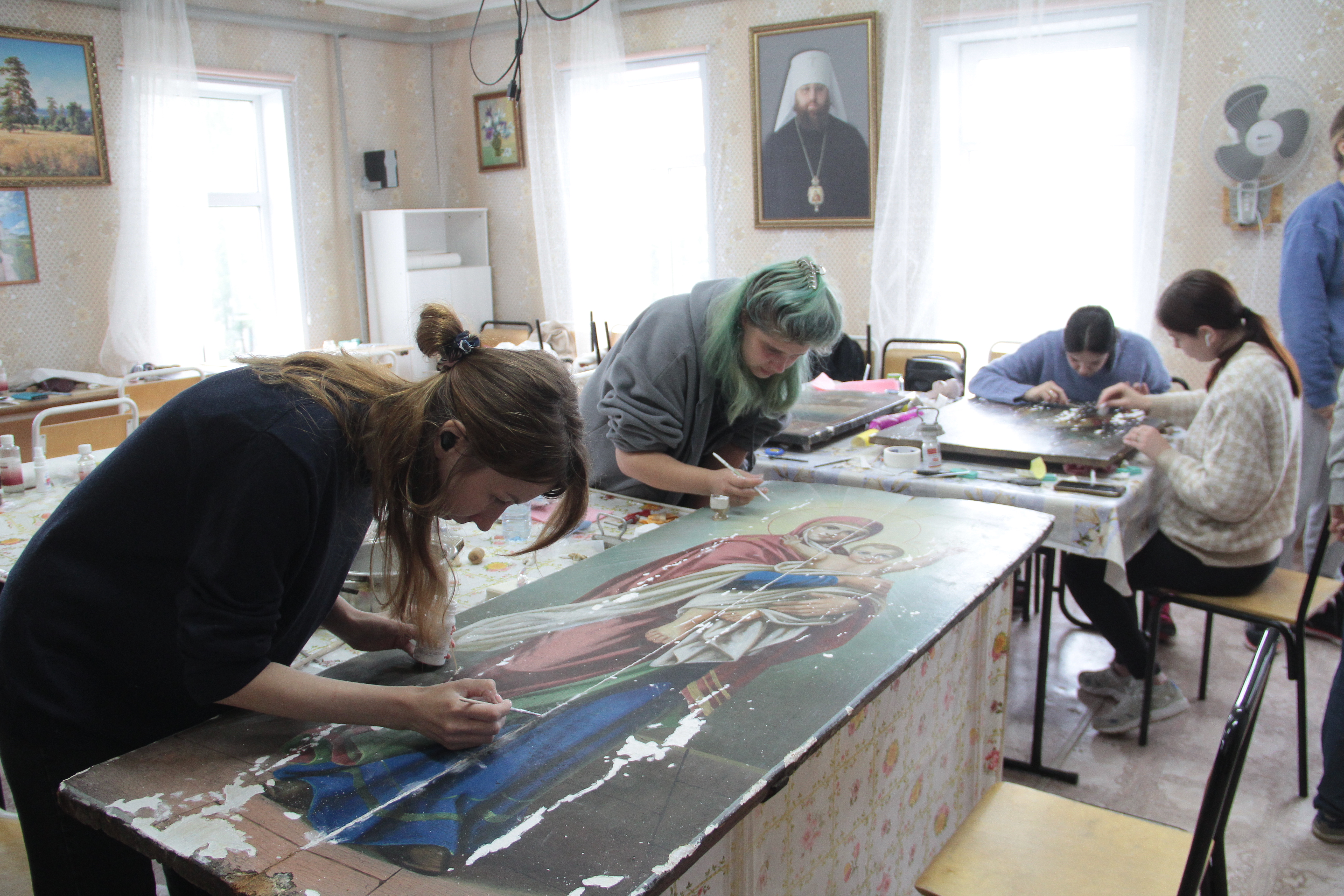 Молодые реставраторы восстанавливают иконы храма Рождества Христова.