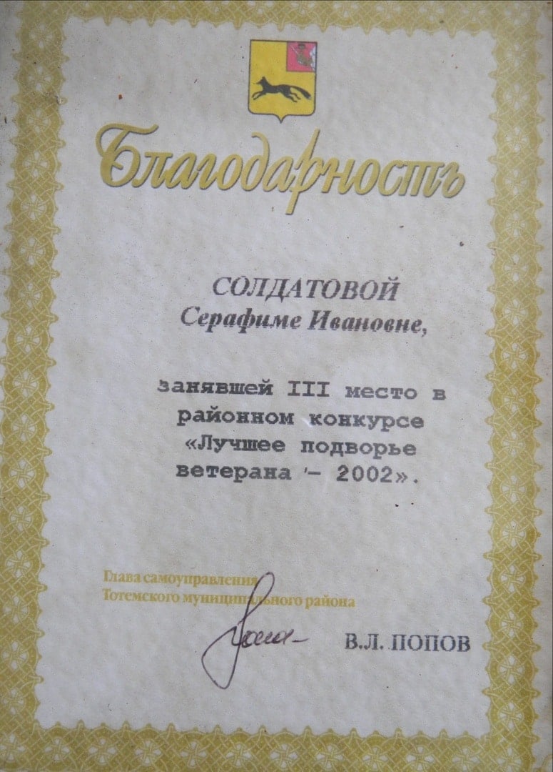 Муж Солдатов Леонид 1930-го года рождения из деревни Лобаново жалел и берег жену, как прочитал заключение врачей. Сам в огороде сажал рассаду, да и тяжести не давал носить. Работал на тракторе и на комбайне. Жили молодые сначала в Лобанове. Дом купили без двора, конюшню перестраивали под двор. Потом вдвоем с сыном Николаем новый дом поставили в Николе. «Все работал, хороший Леонид у меня был, везде успевал, наград -то много у него было на работе! Вот надсадился, в новом доме немного и пожил». Умер муж у Серафимы в 1990 году.