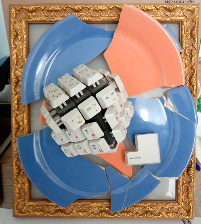 Ещё в начале 1990-х художник увлёкся составлением инсталляций из бросового материала, в первую очередь - устаревшей компьютерной техники. Любые вещи, которые обычно уносят на помойку, дизайнер способен превратить в произведения искусства. И таких работ у Колесникова немало. Его композиции неоднократно экспонировались на персональных выставках в Тотьме, Вологде и даже Москве. Недавно три работы Вячеслава Михайловича пополнили фонды художественного МУзея МУсора «МУ-МУ» Калужской области. Организаторы узнали о тотьмиче от знакомых, побывавших в мастерской художника. Планировали встречу на нашей земле, но из-за карантинных мер перенесли, общались по телефону и интернету. В результате в Калугу отправились инсталляции из компьютерных плат «ЖКХ до реформы» и «ЖХК после реформы», а также «Разбитые мечты» - напоминание о том, что автор хочет освоить компьютерную грамотность в совершенстве, но она до сих пор как кубик Рубика.