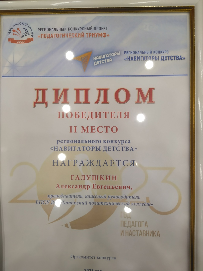 Преподаватель Тотемского политехнического колледжа Александр ГАЛУШКИН стал серебряным призёром регионального этапа Всероссийского конкурса «Навигаторы детства»