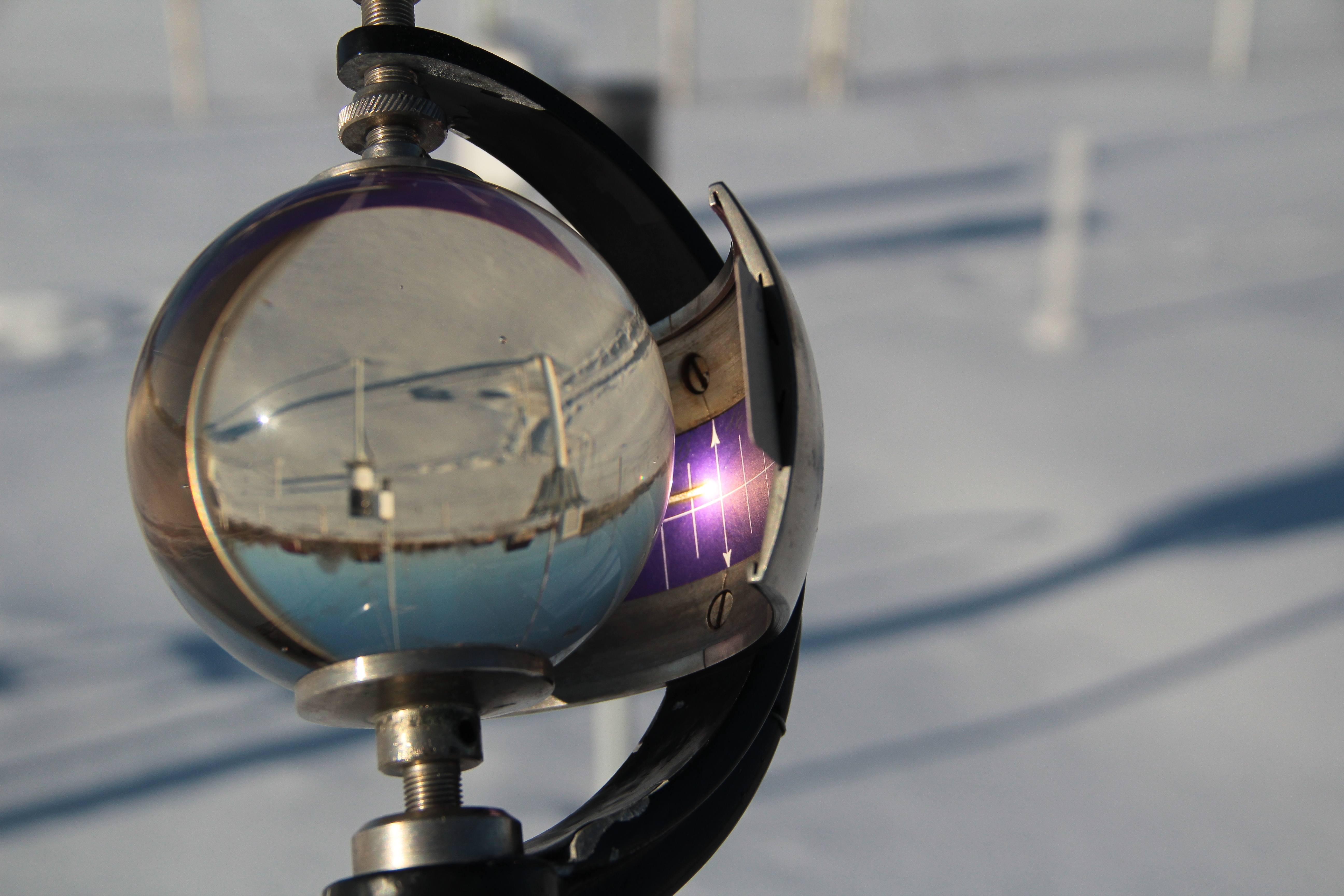 показывающий продолжительность солнечного сияния (на фото). Его показания, оказывается, очень важны. Устройство состоит из твердой стеклянной сферы, обычно около 10 сантиметров в диаметре, которая концентрирует солнечные лучи в одно пятно на калибровочной бумаге, в результате чего на ней получается дорожка от ожога. Благодаря этой простой идее метеорологи могут чётко определить продолжительность солнечного сияния в любой измеренный день.
