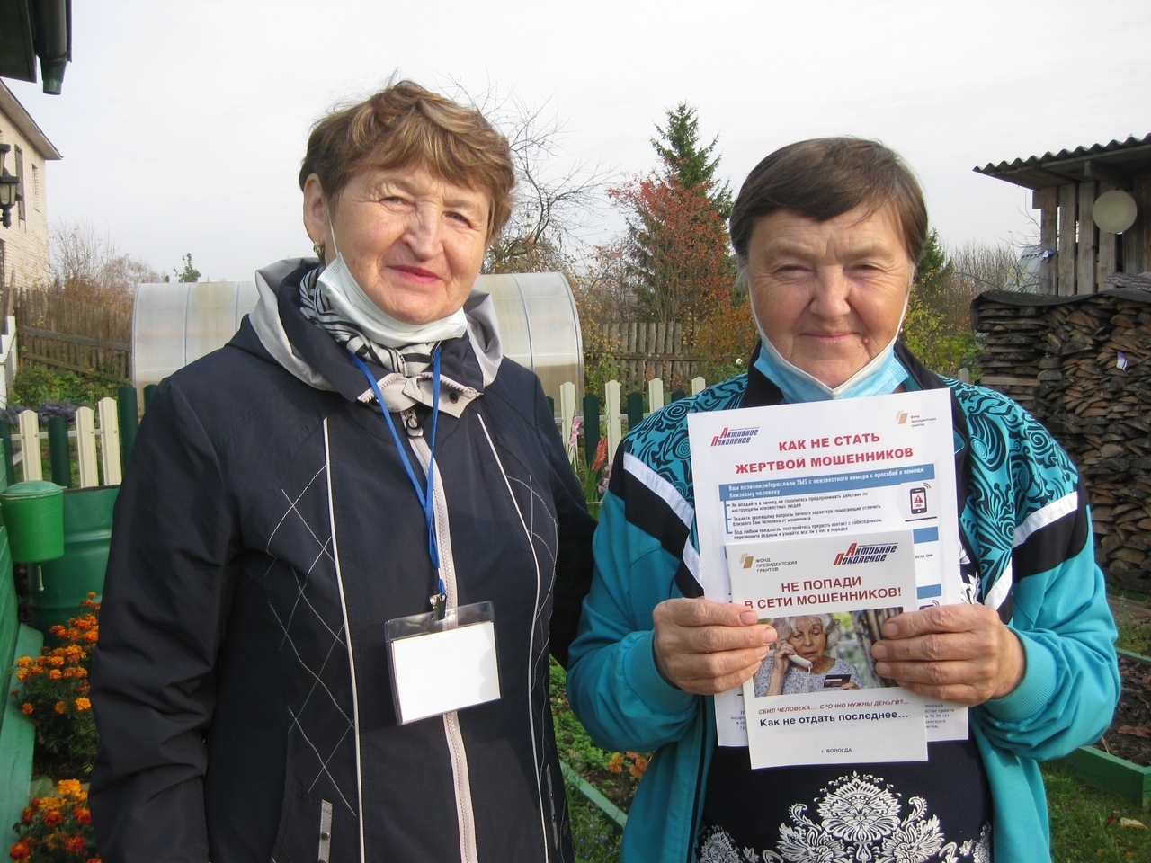 Вологодская региональная общественная организация социальной поддержки граждан «Активное поколение» реализует проект на территориях Бабушкинского и Тотемского районов. Сформированы группы из ответственных пенсионеров, организовано обучение, разработан методический материал, изданы буклеты и информационные листы по профилактике мошенничества. Это главное направление деятельности, так как проблема приобретает невиданные масштабы: особенно часто жертвами злоумышленников становятся одинокие бабушки и дедушки.