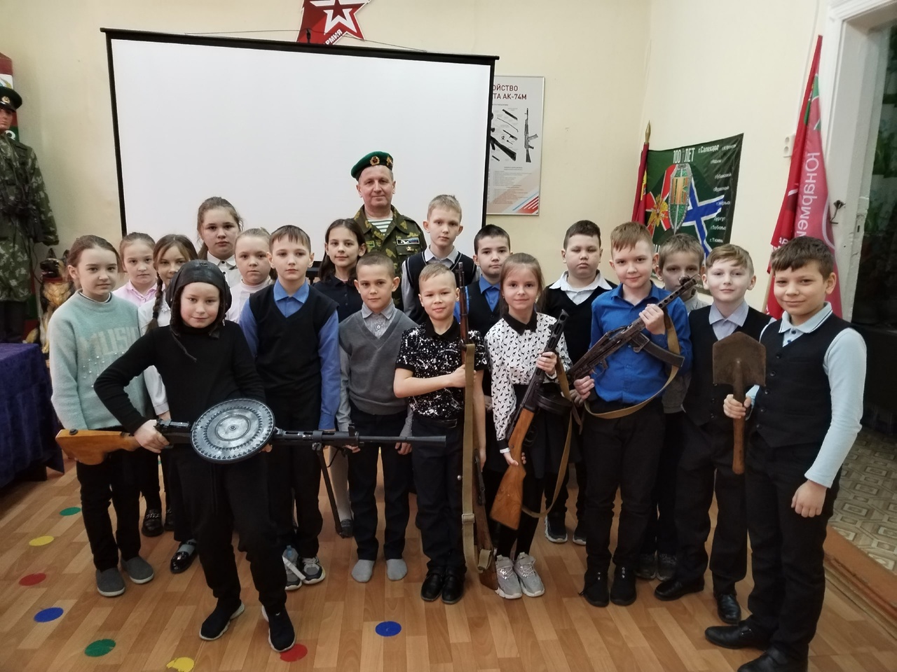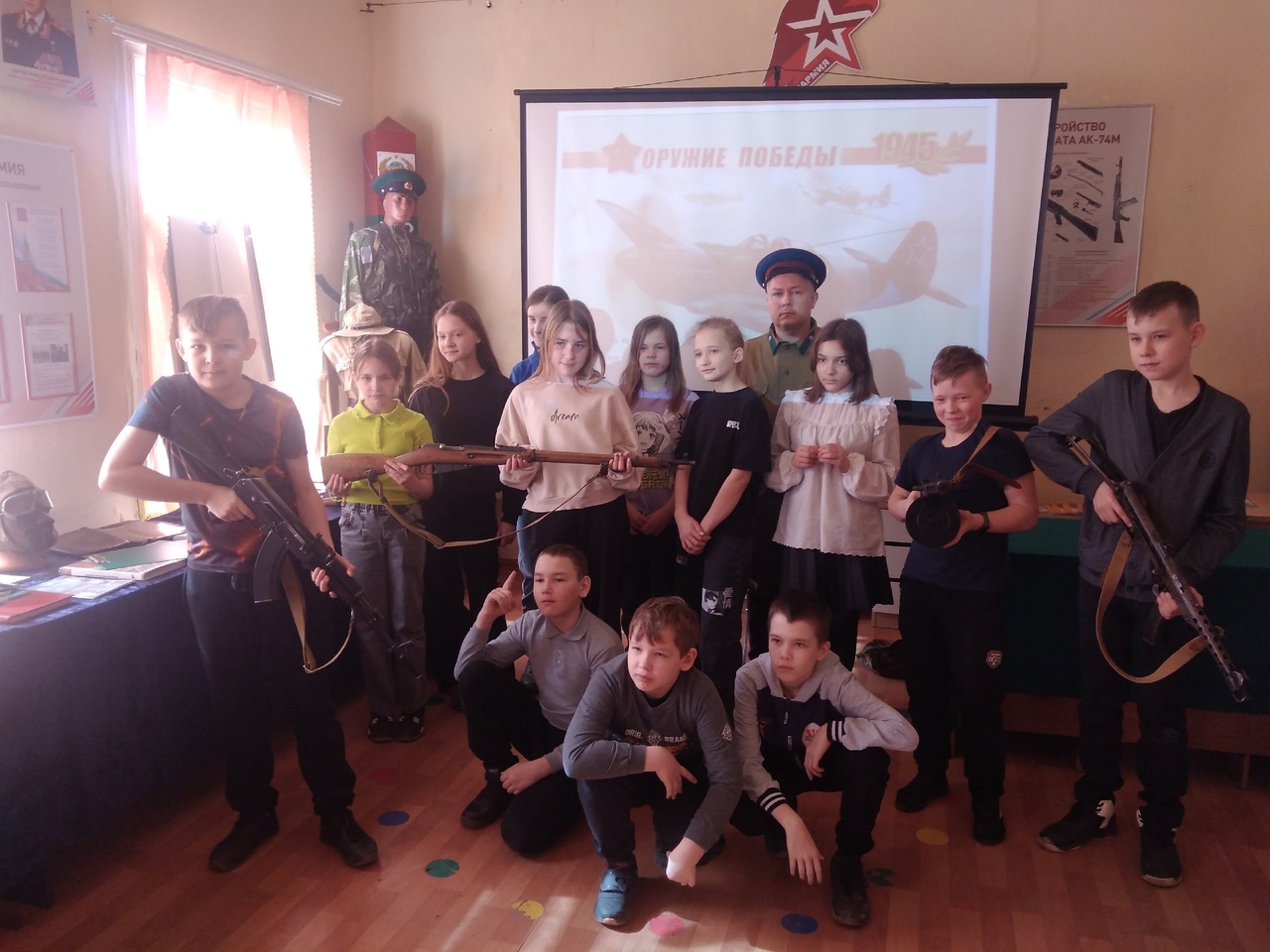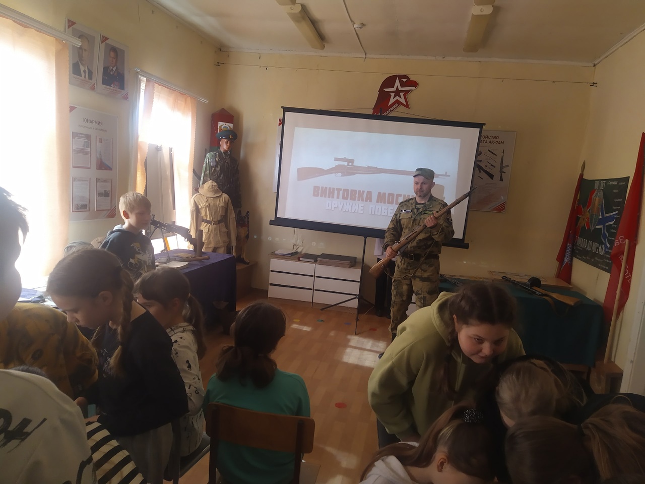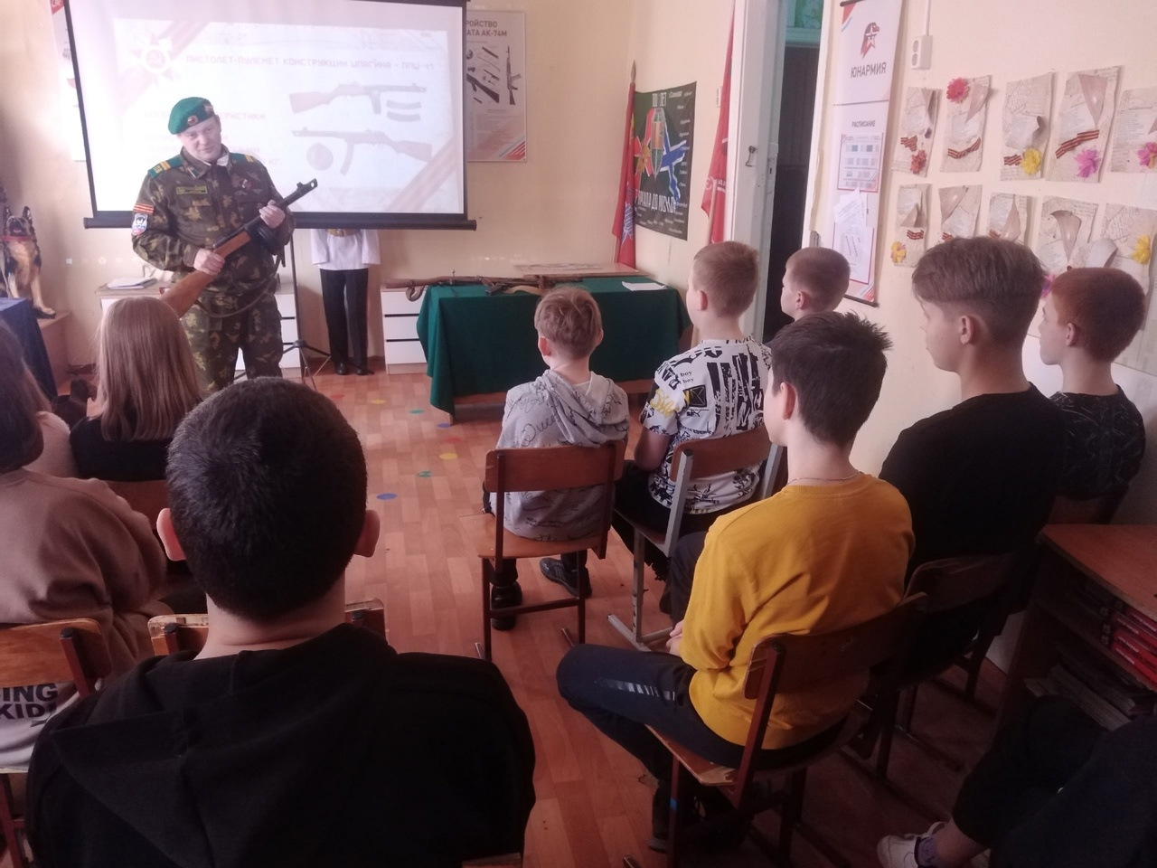Уроки стартовали с тематических занятий "Оружие Победы". Основные мысли, которые доносят до школьников представители боевого братства, это основные знания о легендарном стрелковом оружии, артиллерии, танках, самолётах, морских судах, позволивших советскому народу победить фашизм.