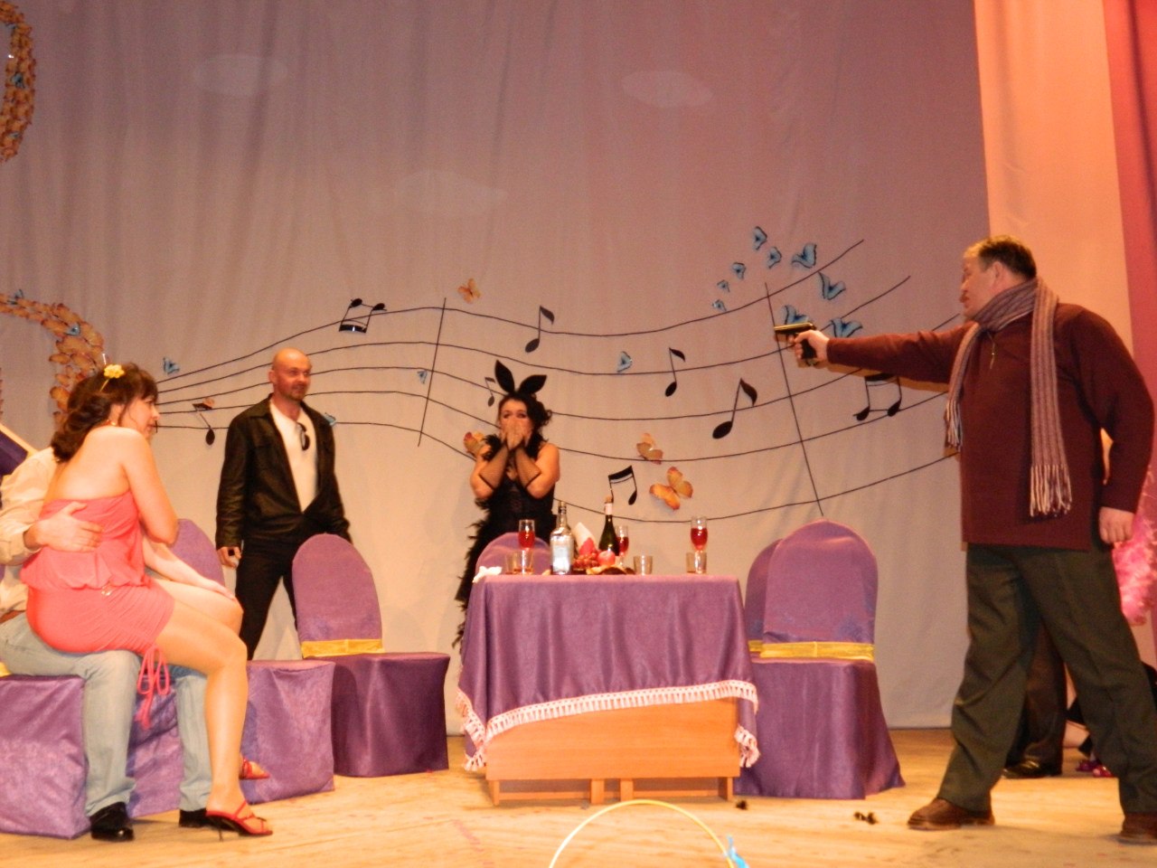 И вот – подожгли с разных мест. Огонь пылает,афиша как надо, уже крыша занялась. Дым, треск лопающегося шифера. Жар стоит такой, что за 30 метров стоять невозможно. Режиссёр кричит в мегафон: